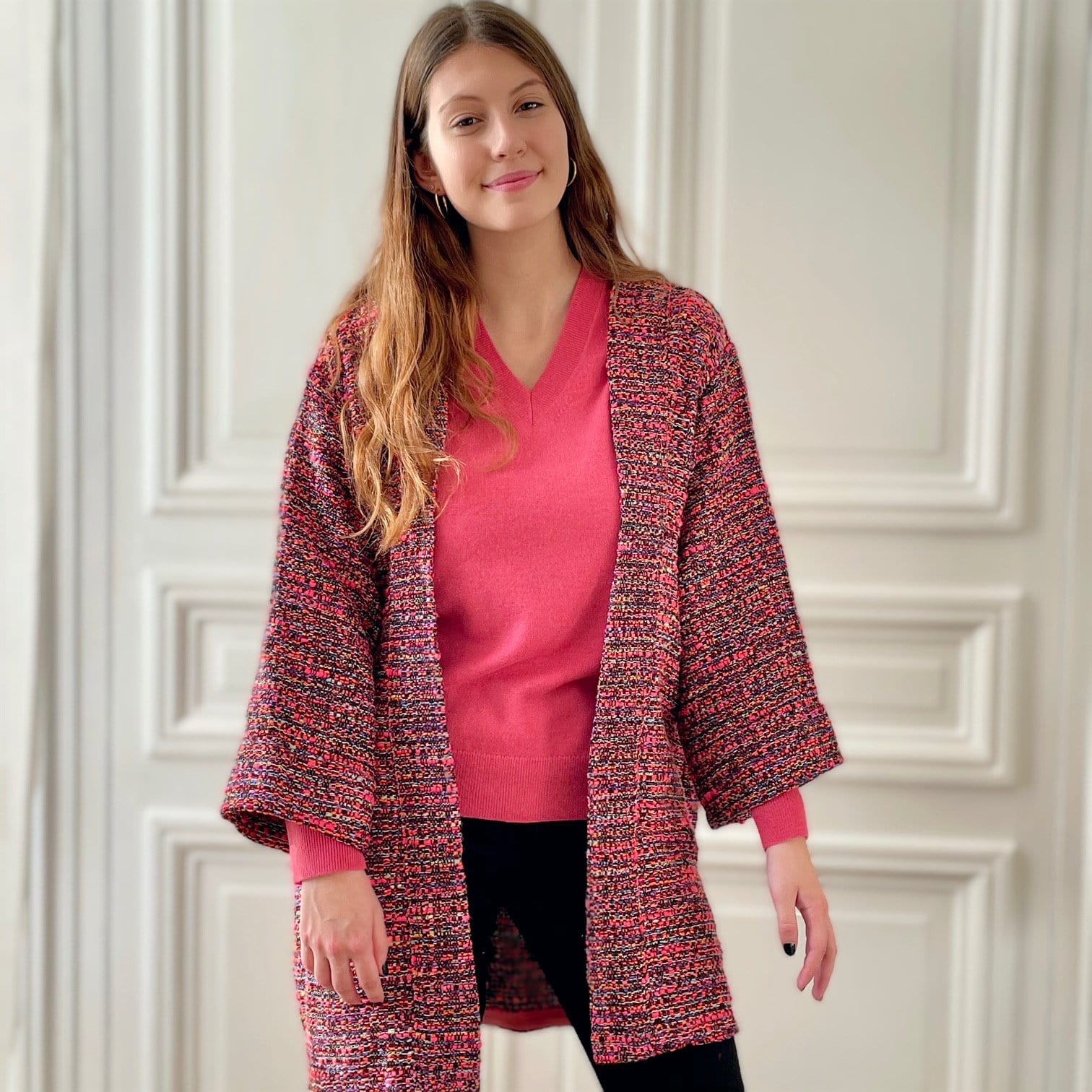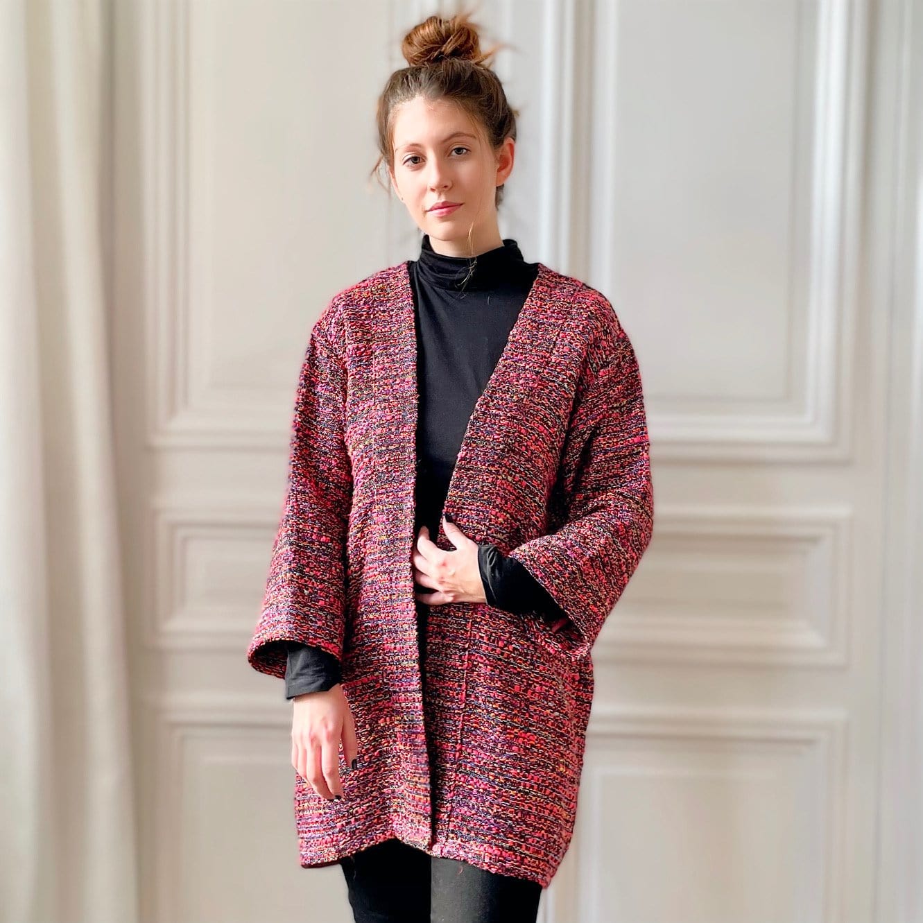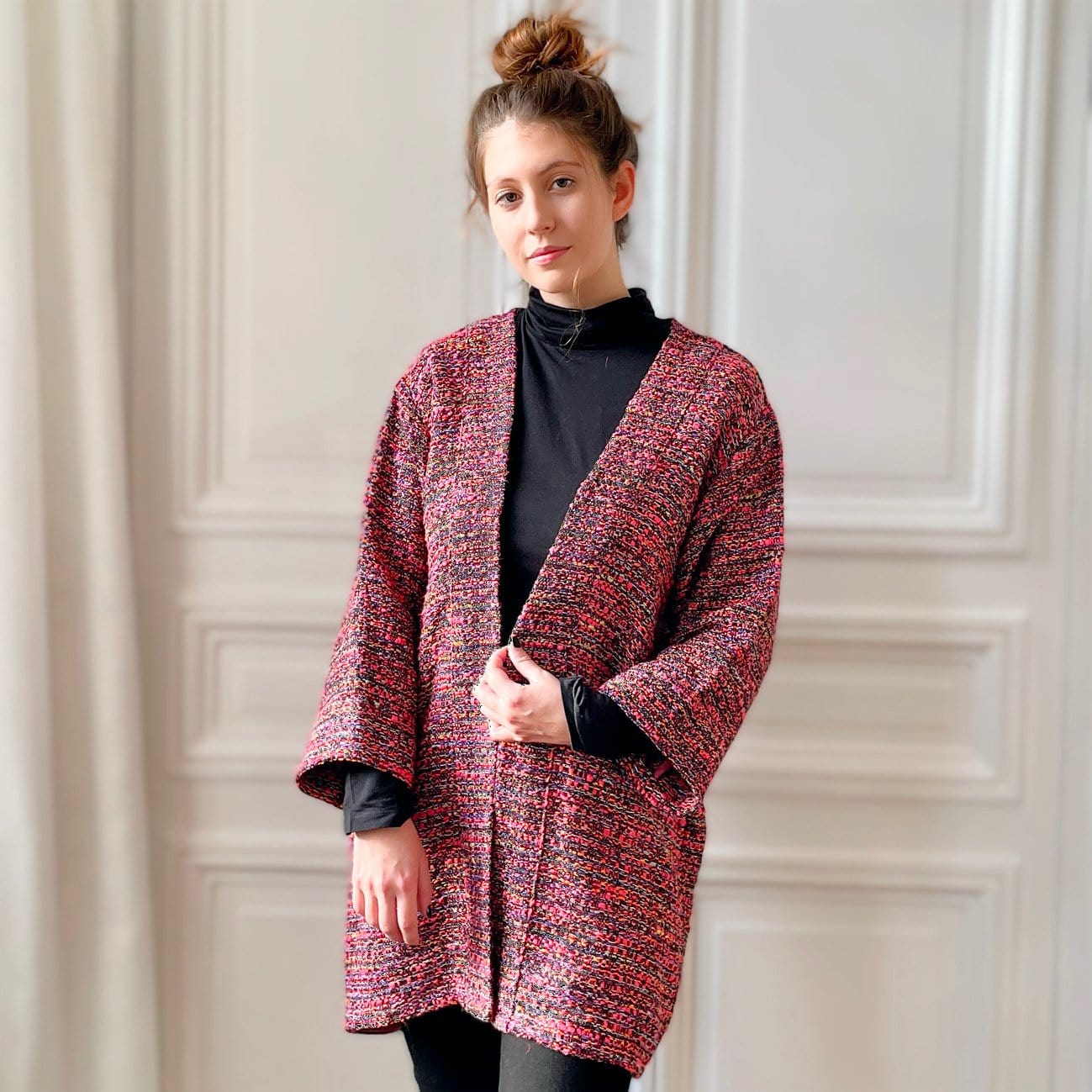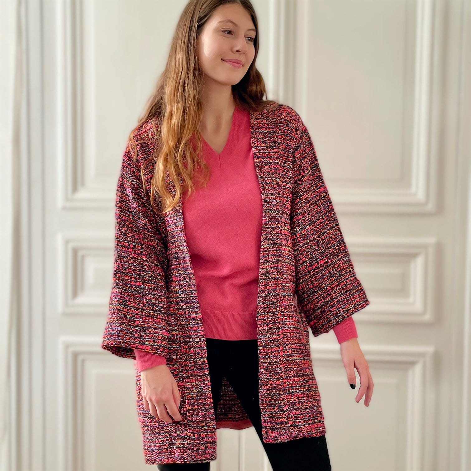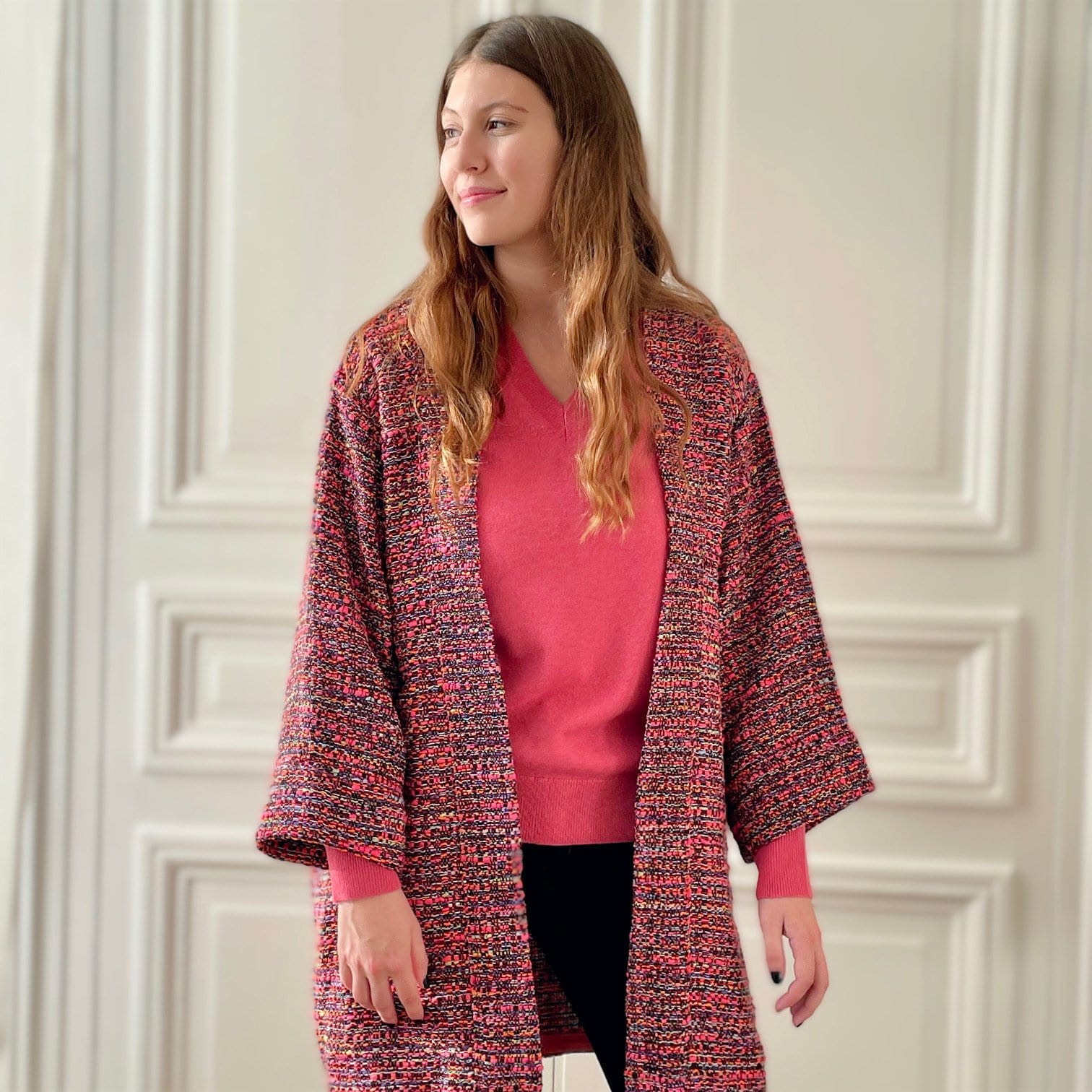 Kimono en tweed rose et noir tissé et fabriqué en France